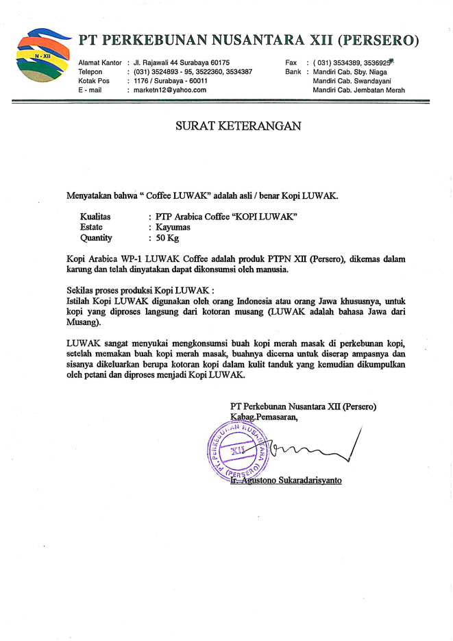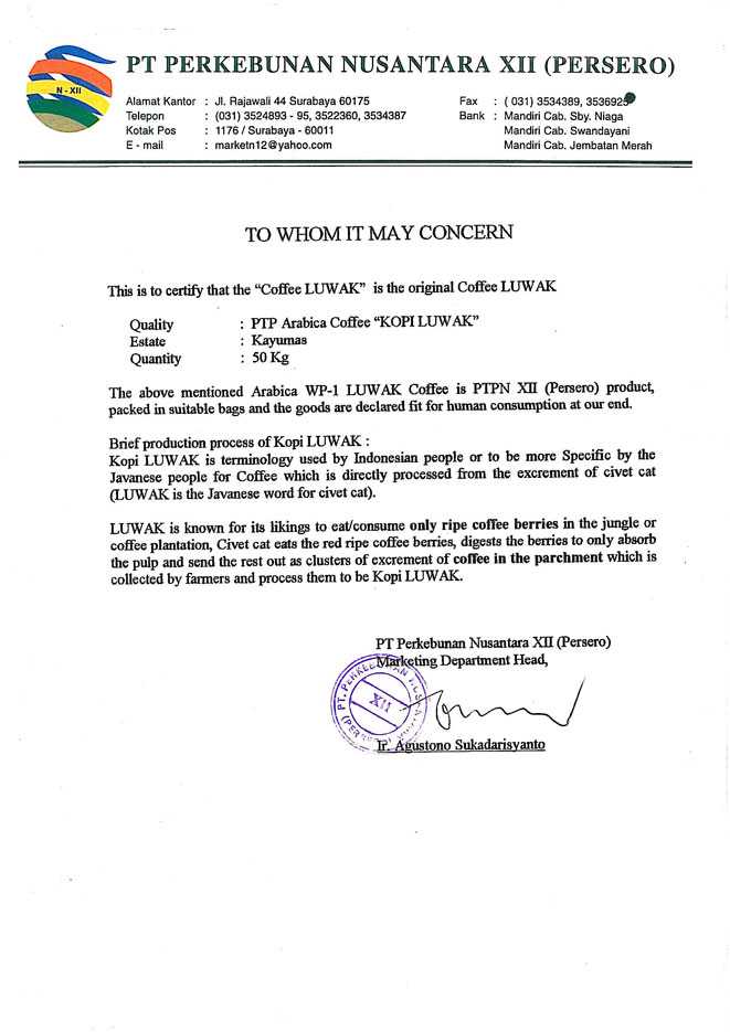 米国ではポンド当たりUS$600にもなったことがあるというルアック。もともと17世紀にオランダがインドネシアを統治しいた時代、農民が作るコーヒーはすべて統治者が取り上げてしまったため、地面にフンと一緒に落ちていたコーヒーを集めて飲まざるを得なかったというのが始まりです。