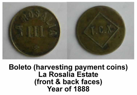 150 年以上も昔、コスタリカ政府は財政難のため、十分な貨幣を鋳造することが出来ず、通貨の流通が限られていました。そのため大農園では、農園独自のコイン (ボレトス)を造り、労働者への支払いに当てていました。労働者はそのコインを持って、農園内の店で買い物をします。店のほうでは、そのコインがある程度 まで貯まると、それを農園へ持ち込み、一般に流通している貨幣へ交換してもらっていました。当時はこのように、農園内で経済活動が行われていました。そし て、政府が十分な貨幣を供給出来るようになった1900年頃に、コーヒーコインの利用が次第になくなっていきました。
