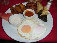 典型的なグァテマラ料理なる物は必ずと言っていい程、バナナのフライ(甘い)、フリホレス(黒豆のペースト)、サルサ、クリーム・チーズが付いて来ます。因みにグァテマラ(他のスペイン語圏でも同じだと思いますが)では、「黒豆(くろまめ)」と「おいしいコーヒー」が男性の間で大人気でした。この言葉を使えばウケる事必至です。ただし男性陣のみへの使用が良いと思われます。なぜか?どちらも女性が赤面するような言葉だからだそうです。