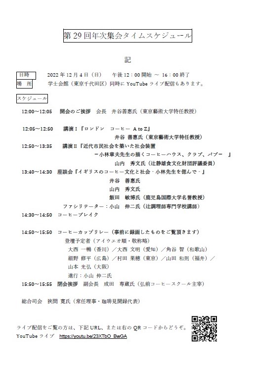 12月4日に、日本コーヒー文化学会の年次集会がリアルとオンラインで開催されます。